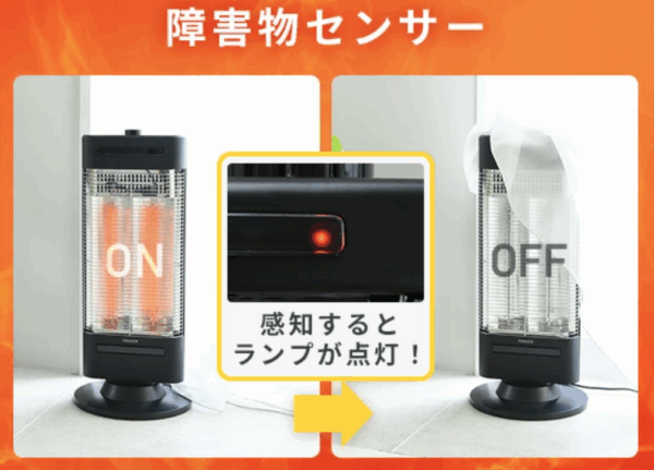 このモデルの最大の特徴は、カーテンや布団などが近づくと自動で電源が切れる「障害物センサー」を搭載している点です 。