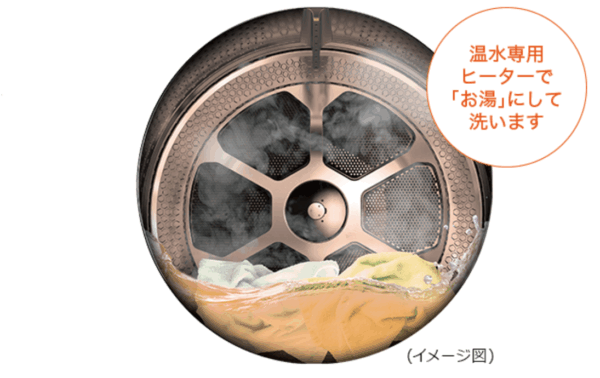 ヒーターで洗濯水(または洗剤液)を直接加熱し、皮脂汚れや黄ばみを効果的に落とします。